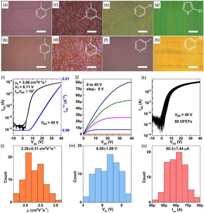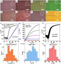 | Fig. 16. (a-h) The optical microscopy (OM) images of C60 crystals grown from different solvents. Molecular structure of solvents was shown at the top right corner of each figure. The scale bars in all figures are 50 µm. (i, j) Typical transfer and output characteristics curve of the C60-crystal-based devices. (k) Transfer characteristics curves of 80 OFETs on a 19 mm × 10 mm substrate. Histogram of the mobility (l), threshold voltage (m), and on-state current (n) based on the 80 OFETs. Reproduced with permission [148]. Copyright 2024, Wiley Publishing Group. | |