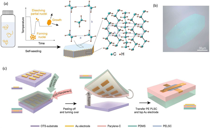 | Fig. 17. (a) Illustration of the fabrication process and the crystal structure of PE PLSCs. (b) An optical microscope (OM) image of PE PLSC. (c) The fabrication process of MIM capacitor device. Reproduced with permission [161]. Copyright 2024, Wiley Publishing Group. | |