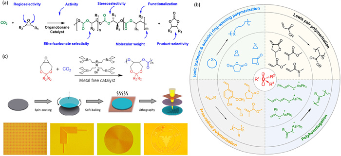 | Fig. 2. (a) Progress in converting CO2 and epoxides into aliphatic polycarbonates. Reproduced with permission [6]. Copyright 2024, American Chemical Society. (b) Organoboron compounds as versatile catalysts and mediators for diverse polymerization modes. Reproduced with permission [5]. Copyright 2024, The Royal Society of Chemistry. (c) Aqueous-developable CO-PCs bearing acid-cleavable acetal groups, serving as high-performance photoresists. Reproduced with permission [10]. Copyright 2024, Wiley Publishing Group. | |