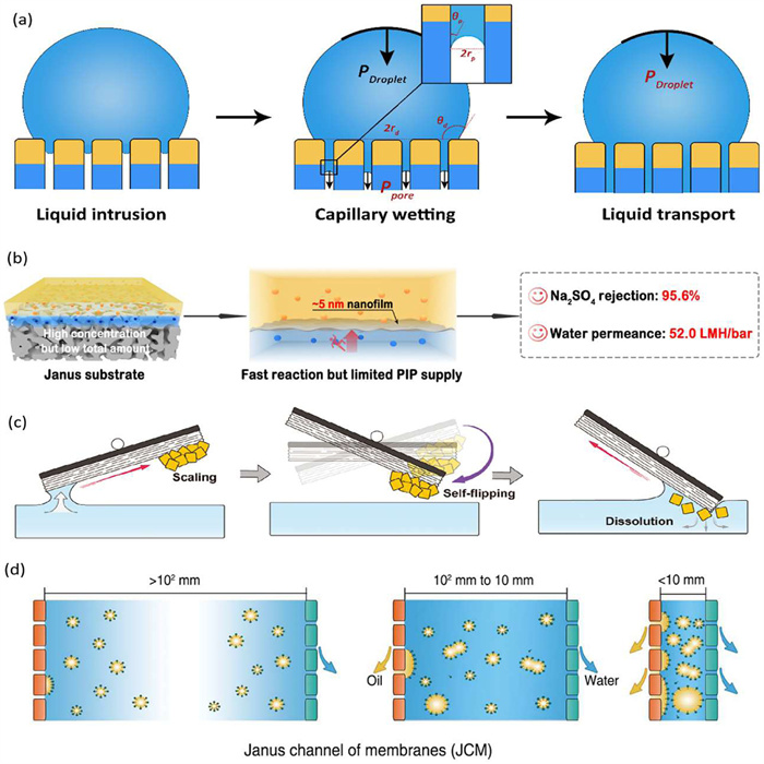 | Fig. 4. (a) Three-stage mode of unidirectional liquid transport through Janus membrane. Reproduced with permission [19]. Licensed under CC-BY. (b) Janus substrate to regulate interfacial polymerization. Reproduced with permission [20]. Licensed under CC-BY. (c) Janus seesaw evaporator for self-descaling during hypersaline brine evaporation. Reproduced with permission [21]. Copyright 2024, Wiley Publishing Group. (d) Janus channel of membranes for concurrent recovery of oil and water from emulsions. Reproduced with permission [23]. Copyright 2024, American Association for the Advancement of Science. | |