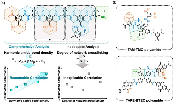 To ensure accurate calculation of HABD, the research group has designed an optimized X-ray photoelectron spectroscopy data processing protocol and calculation method that employ the cross-peak self-consistency of atoms in diverse chemical environments. These designs enable HABD to accurately describe the network structure of desalination-oriented polyamide membranes, specifically those developed through the reaction of trimesoyl chloride with piperazine and m-phenylenediamine, for reverse osmosis and nanofiltration polyamides. Furthermore, HABD exhibits a theoretically expected correlation with water/salt separation performance in desalination membranes, where increasing HABD results in a consistent decrease in water permeance and a significant increase in salt rejection. Additionally, HABD can be extended to complex polyamides, formed by highly functional monomers, to design customized crosslinked polyamide networks that go beyond the scope and ability of DNC.