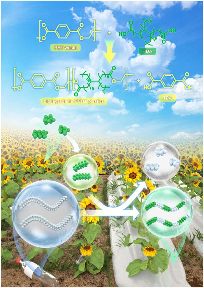 The group utilized PET waste and bio-based hydrogenated dimer acid (HDA) as feedstocks, to synthesize biodegradable poly(ethylene hydrogenated dimerate-co-terephthalate) (PEHT) plastics through melt reaction without any additional catalyst (Fig. 7) [47]. This carboxyl-ester transesterification was based on the principle of replacing terephthalic acid (TPA) with nonvolatile HDA in the polymer chain. TPA removal is the key to producing high molecular weight PEHT. Various PEHTs with different chemical compositions were synthesized by simply tuning the feed ratio of HDA to PET. Without additional catalyst and solvent, this macromolecular reaction can be facilely carried out on current equipment of polyester industry, thus will enable low-cost and large-scale production. This process achieves 100% atomic utilization, due to the repeated application of by-product TPA in the polyester industry. With excellent mechanical properties, regulable flexibility and great biodegradability, PEHT is expected to become a competitive candidate of high value-added biodegradable material. Moreover, with good film-forming performance, PEHT is promising to be applied as biodegradable mulch films on a large scale. The research group is looking forward to solving the ecological environment sustainability issues associated with end-of-life PET by this feasible upcycling approach.