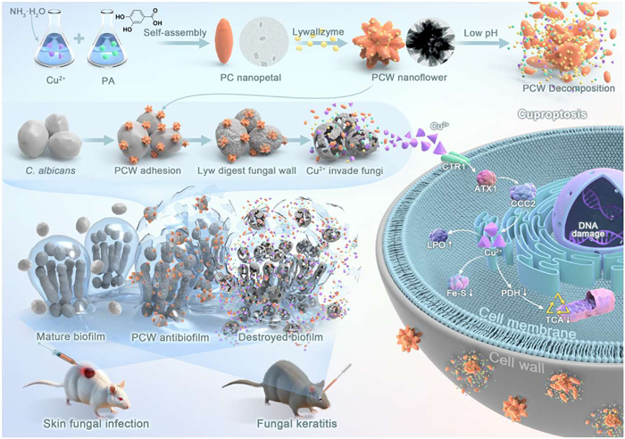 Fungal infection has become a serious public health problem in the world due to the very limited antifungal drugs in clinic and increasing drug resistance [67-69]. Especially, invasive fungal infections can result in high morbidity. It is urgently needed to develop innovative non-antibiotic antifungal strategies for the treatment of fungal infections [70-72]. Transition metals such as silver, copper, and zinc are well-known antifungal drugs [73,74]. However, the in vivo antimicrobial applications of transition metal ions are strongly restricted owing to the deactivation by proteins [75]. In order to improve the fungicidal efficacy of metal ions in vivo, the researchers prepared Cu2+-containing nanoflowers by supramolecular self-assembly (Fig. 9) [76]. Protocatechuic acid (PA)-Cu2+ (PC) nanopetals were synthesized via coordination self-assembly of Cu2+ and PA. Lywallzyme (Lyw)-loaded PC (PCW) nanoflowers were then synthesized by Lyw-induced assembly of PC nanopetals. PCW nanoflowers could effectively adhere onto fungal cells. Lyw was then released from PCW nanoflower to digest the fungal cell walls, which facilitated the internalization of Cu2+ by fungal cells. Therefore, PCW nanoflowers exhibited much stronger fungicidal activity than dissociative Cu2+. It should be emphasized that PCW nanoflowers exhibited strong fungicidal activity in protein-rich environment, while dissociative Cu2+ was completely deactivated with very limited fungicidal effect. Furthermore, the internalization of abundant Cu2+ by fungal cells, led to a decrease of pyruvate dehydrogenase (PDH) activity, a restricted tricarboxylic acid (TCA) cycle, reduced Fe-S cluster proteins, and significant lipid peroxides (LPO) accumulation, which implied that PCW nanoflowers could induce fungicidal cuproptosis. It is the first example about the occurrence of cuproptosis in fungal cells, which provides a new strategy for the treatment of fungal infections.