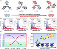 | Fig. 13. (a) Single-crystal structures of TNM isomers and the manipulating strategies presented in this work. (b) Photoluminescence (PL) spectra of 222-TNM, 122-TNM, 112-TNM, and 111-TNM in ACN/water mixtures with different water fractions (fw), concentration (c) = 10 µmol/L. (c) Schematic plot of the relationship between intramolecular and intermolecular interactions and the strength of TSC, and the schematic plot of the relationship between the aggregate flexibility and TSC-emission wavelength of TNM isomers. Reproduced with permission [112]. Copyright 2024, Springer Nature. | |