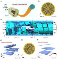 | Fig. 3. Schematic of the concept of bidirectionally promoting assembly order of graphene. (a) GO fibers prepared by multiple shear-flow fields. (b-f) Structural illustration of the sheet-order in the whole spinning tube under multiple flow fields (c), where Plane Ⅰ (d, e) shows the aligned sheets along the flow direction but wrinkling conformation in perpendicular direction under the unidirectionally flow field, Plane Ⅱ (f) presents the aligned slices in two directions under multiple flow fields, and Plane Ⅲ (b) depicts the optimally concentric structure by bidirectionally propelling assembly order. Copied with permission [12]. Licensed under CC-BY. | |
