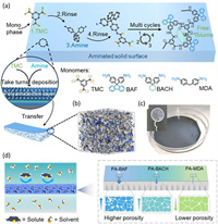 Recently the researchers developed a liquid-phase molecular layer-by-layer deposition (MLD) technique to fabricate aromatic polyamide (PA) nanofilms, which served as selective layers of thin-film composite (TFC) membranes used in OSN process (Fig. 5). The resultant nanofilms exhibited tunable thickness within the range from 10 nm to 50 nm, significantly thinner than that achieved by traditional interfacial polymerization [24]. This technique allows precise design and control of membrane microstructures at molecular level. They further demonstrated the use of MLD to synthesize PA nanofilms with controlled microporosity, achieving a thickness of 25 nm and exceptional solvent permeance by introducing amine monomers with aromatic rings and non-planar configuration into reaction system [25]. To extend the application of this technique, covalent organic polymer (COP) nanofilms were synthesized through the Schiff-base reaction with a slower reaction rate. The ultrathin nanofilms exhibited precisely tunable solute rejection profiles in molecular weight range of 200–400 Da, which was significant for fine separations in pharmaceutical molecules [26]. The researchers further incorporated cardo-pendant groups into amine monomers and developed PA nanofilms with enhanced ultramicroporosity and a thickness of 23–36 nm [27]. These studies collectively highlight the importance of monomer design and MLD in creating membranes with high solvent permeability, precise molecular sieving, and robust stability, and offers a promising pathway for developing next-generation OSN membranes with improved performance in energy-efficient separations. To achieve green manufacturing of polymeric OSN membranes, the research team proposed a novel strategy to prepare integrally-skin asymmetric (ISA) polyimide (PI) membranes by the combination of non-solvent induced phase separation (NIPS) and thermal-induced surface densification [28,29]. They further extended this approach to poly(ether sulfone) (PES) membranes, demonstrating that sub-Tg thermal treatment can generate acid-resistant NF membranes with a ultra-thin skin layer and high water permeance [30]. In addition, tris(hydroxymethyl) aminomethane (Tris) was chemically grafted onto PI membranes followed by thermal annealing. It was found that the required annealing temperature was significantly lowered, while the solvent resistance and separation accuracy were improved [31]. These studies highlight the significant progress made in membrane science, emphasizing the importance of material design, fabrication techniques to achieve high-performance solvent-resistant polymeric membranes for precise molecular separations.