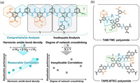 | Fig. 6. (a) Comparison of harmonic amide bond density (HABD) and the degree of network crosslinking (DNC) in analyzing structures and performances of desalination polyamide membranes. (b) HABD for analyzing complex crosslinked polyamide networks. Reproduced with permission [32]. Licensed under CC-BY. | |