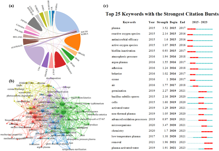 | Fig. 2. (a) National publication volume and cooperation relationship. (b) Average year publication volume and keyword frequency of plasma disinfection. (c) Keywords with the strongest citation burs. The data in this figure is sourced from Web of Science, with the keywords “plasma or PAW” and “disinfection, and the retrieval date is from 2015 to 2021. | |