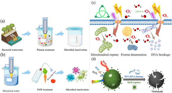 | Fig. 4. (a) Treatment of microorganisms in water by NTP. (b) PAW disinfection. The inactivation mechanism of (c) fungi and (d) virus. | |