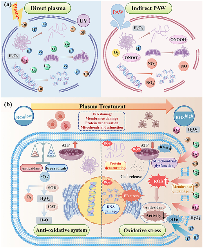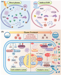 | Fig. 6. (a) Important active species in the treatment of plasma and PAW. (b) Antioxidant system in the plasma treatment process (By Figdraw). | |