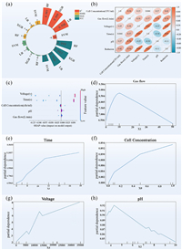 | Fig. 5. (a) The radial cylinder chart compares the performance of machine learning models. (b) The correlation heatmap demonstrates the correlation between influencing factors and the degradation rate. (c) The five most important factors associated with the plasma degradation efficiency of E. coli determined by Tree SHAP. The PDP analysis chart shows the impact of individual factors on the degradation rate: (d) Gas flow, (e) time, (f) cell concentration, (g) voltage, (h) pH. | |