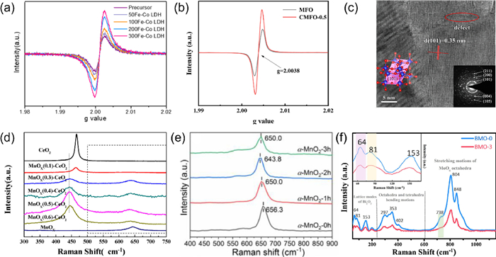 | Fig. 3. (a) EPR images of Fe-Co LDH at different calcination temperatures. Reprinted with permission [48]. Copyright 2021, Elsevier. (b) EPR spectra of MFO and CMFO-0.5. Reprinted with permission [49]. Copyright 2022, Elsevier. (c) HRTEM images of Fe/TiO2-x-S. Reprinted with permission [91]. Copyright 2022, Elsevier. (d) Raman spectra of MnOx(z)-CeO2. Reprinted with permission [93]. Copyright 2018, Elsevier. (e) Raman spectra of α-MnO2 with different reduction times. Reprinted with permission [94]. Copyright 2023, Elsevier. (f) Raman spectrum of BMO-0 and BMO-3. Reprinted with permission [95]. Copyright 2019, Elsevier. | |