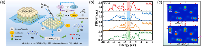 | Fig. 4. (a) The Proposed mechanisms of MB degradation in CoFe-LDO-BC + O3 system. Reprinted with permission [55]. Copyright 2023, Elsevier. (b) PDOS of Fe 3d. Reprinted with permission [97]. Copyright 2024, Elsevier. (c) The charge density of α-MnO2-x and α-MnO2-x-2. Reprinted with permission [98]. Copyright 2024, Elsevier. | |