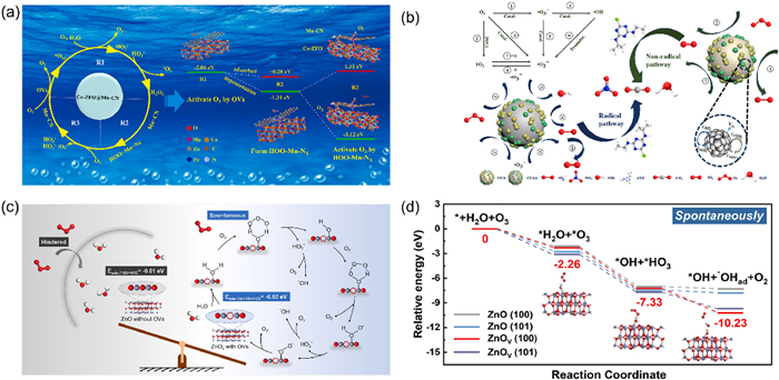 Xu et al. [99] successfully prepared Co-ZFO@Mn-CN catalysts through cobalt doping. Their EPR and XPS analyses indicated that the lattice doping of cobalt induced the formation of a significant number of oxygen vacancies. Furthermore, DFT calculations revealed that ozone adsorbs onto these oxygen vacancies. Due to the strong Lewis acidic nature of these vacancies, the O–O bond length in ozone undergoes stretching, extending from 1.284 Å to 2.212 Å. This stretching of the bond length results in the decomposition of ozone, yielding oxygen and adsorbed oxygen (*O). Subsequently, these products engage in a series of chain reactions with dissolved ozone, leading to the production of 1O2 and O2- (Fig. 5a). Ultimately, these reactions promote the degradation process. Wu et al. [100] synthesized CuO–CeO2-activated carbon loaded attapulgite (CCAA) through a straightforward hybrid calcination approach. The incorporation of CuO–CeO2 and activated carbon elevated the concentration of oxygen vacancies. EPR experiments, quenching tests, and probe experiments revealed that the primary reactive species in this system is 1O2. DFT calculations further demonstrated that the oxygen vacancies on the catalyst surface exhibit a high affinity for ozone molecules. Upon adsorption of ozone onto these vacancies, the O–O bonds in the ozone molecule spontaneously cleave, initiating the formation of surface-bound atomic oxygen and 1O2 (Fig. 5b).