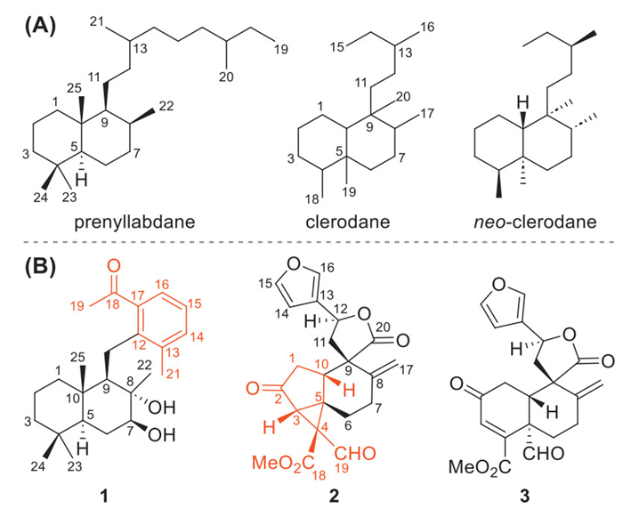 | Fig. 1. (A) Structures of prenyllabdane and (neo)clerodane. (B) Structures of compounds 1–3. | |