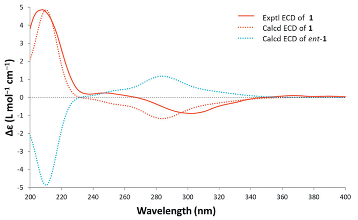 | Fig. 3. Experimental and calculated ECD spectra of compound 1. | |