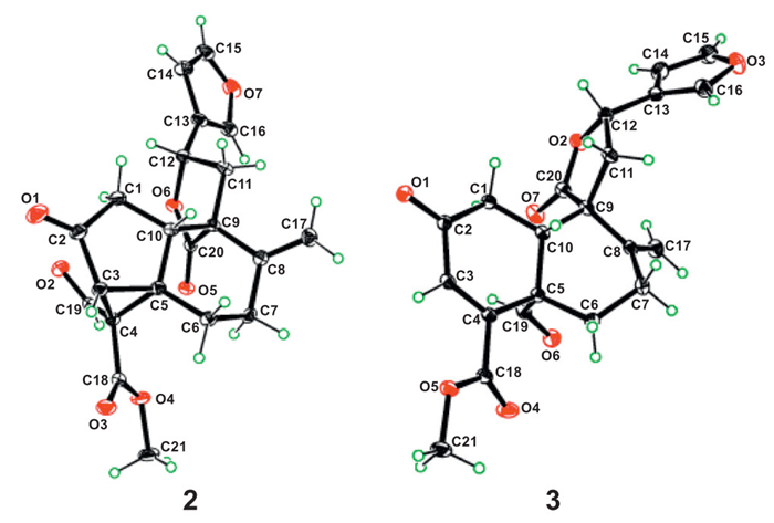 | Fig. 5. X-ray ORTEP drawings of compounds 2 and 3 with 20% thermal ellipsoid probability. | |