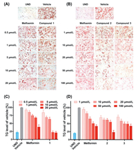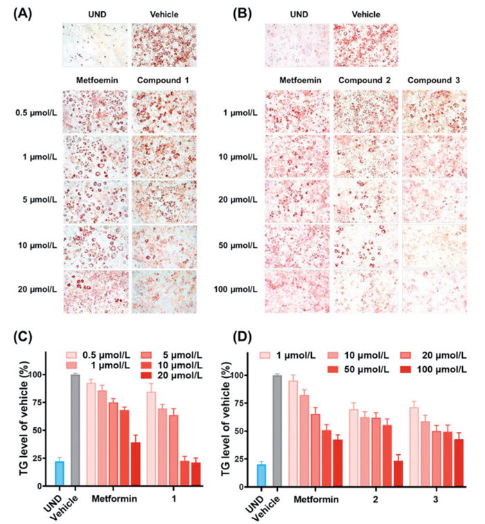 | Fig. 8. Antiadipogenic activity of metformin and compounds 1–3 in 3T3-L1 adipocytes. (A, B) Representative microscopy images were captured after ORO staining (×200). UND: undifferentiated group. (C, D) TG levels under the interference of indicated compounds. TG levels were tested by ORO staining and TG assay. The TG level of differentiated group (vehicle) without compounds treatment was viewed as 100%. Data represent mean ± SD of three independent experiments. | |