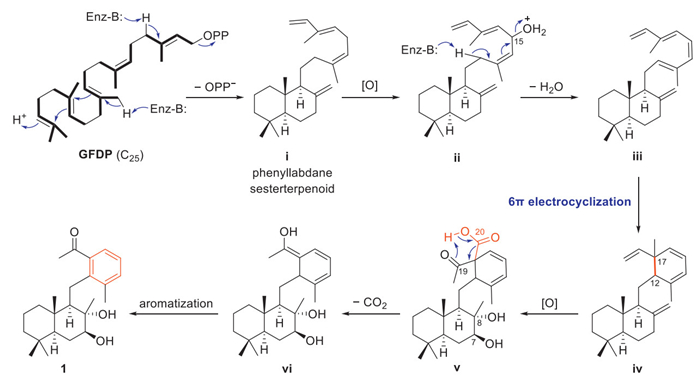 Crolatinoid C (3), which took the form of colorless crystals, possesses the molecular formula C21H20O7, based on analysis of its (+)-HRESIMS and the 13C NMR data. Its NMR data were highly similar to that of a known neoclerodane diterpenoid, mangelonine H [41], indicating that they are structural analogs. The only difference between them was the presence of a C-2 keto carbonyl group (δC 197.1) conjugated with the Δ3(4) double bond in 3 instead of the C-2 methylene group in the latter. This assignment was verified by scrutiny of the HMBC and 1H–1H COSY correlations (Fig. 6). Further interpretation of the NOESY data revealed that compound 3 shared the same relative configuration as mangelonine H. Lastly, based on XRD analysis [Fig. 5, Flack parameter = 0.01(9)] [40], the absolute configuration of 3 was unambiguously determined to be 5S,9S,10S,12S as depicted. Crolatinoids A (1) and B (2) both exhibit novel skeletal structures, leading us to undertake an investigation into their biosynthetic origins. From a structural and biogenetic perspective, compound 1 likely originated from a phenyllabdane sesterterpenoid (Scheme 1), e.g., ⅰ that was formed through enzyme-catalyzed cyclization and elimination of geranylfarnesyl diphosphate (GFDP). Subsequent oxidation would give intermediate ⅱ, which undergoes a dehydration process to produce polyene ⅲ. A subsequent 6π electrocyclization connects C-12 and C-17, affording cyclohexadiene ⅳ. Oxidation at the C-7, C-8, C-19, and C-20 positions would result in intermediate ⅴ, featuring a vicinal diol and β-keto carboxylic acid group. Then, this intermediate would undergo an intramolecular decarboxylation to form enol vi, which would transform into compound 1 via enol-keto tautomerism and oxidative aromatization.