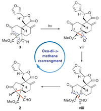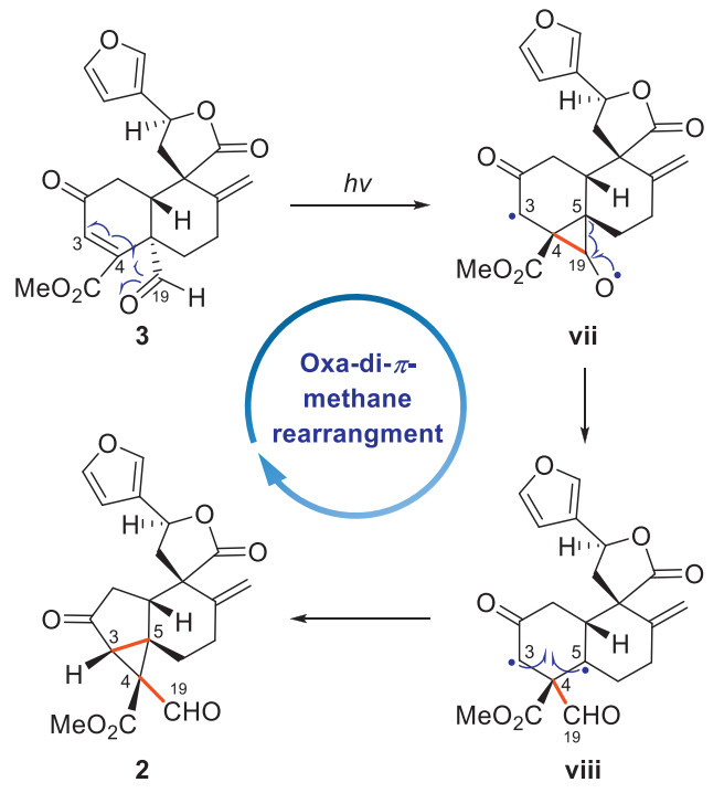Compound 2 is characterized by an unprecedented 19(5→4)-abeo-3,5-cycloneoclerodane skeleton, which is hypothesized to be biogenetically derived from compound 3 through an oxa-di-π-methane rearrangement (Scheme 2) [42]. Specifically, upon photochemical irradiation, compound 3 would initially undergo homolytic cleavage of both the Δ3(4) double bond and the C-19 aldehyde carbonyl group, which is followed by the formation of the C-4–C-19 bond, yielding the diradical intermediate ⅶ. Subsequent C-5–C-19 bond cleavage would generate the intermediate ⅷ, which would be converted into compound 2 via the C-3–C-5 bond formation. To validate the biosynthetic hypothesis, a transformation from 3 to 2 was envisaged. However, the minute isolated quantity of compound 3 (1.0 mg) hindered this endeavor, necessitating additional verification through a synthetic approach.