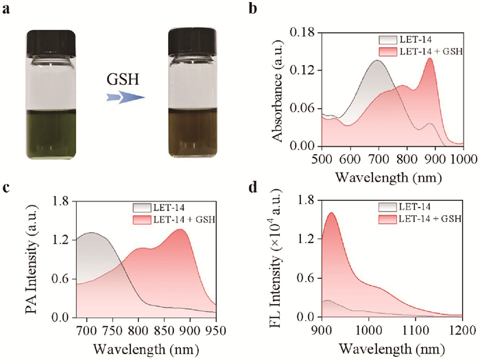 | Fig. 1. (a) Color change of LET-14 towards GSH. (b) UV–vis-NIR absorption, (c) PA spectra, and (d) NIR-Ⅱ FL (λex = 880 nm) of LET-14 (10 µmol/L) after incubation with/without GSH (50 µmol/L) for 30 min in dimethyl sulfoxide (DMSO)/phosphate buffered saline (PBS) (v/v = 2/3, pH 7.4). | |
