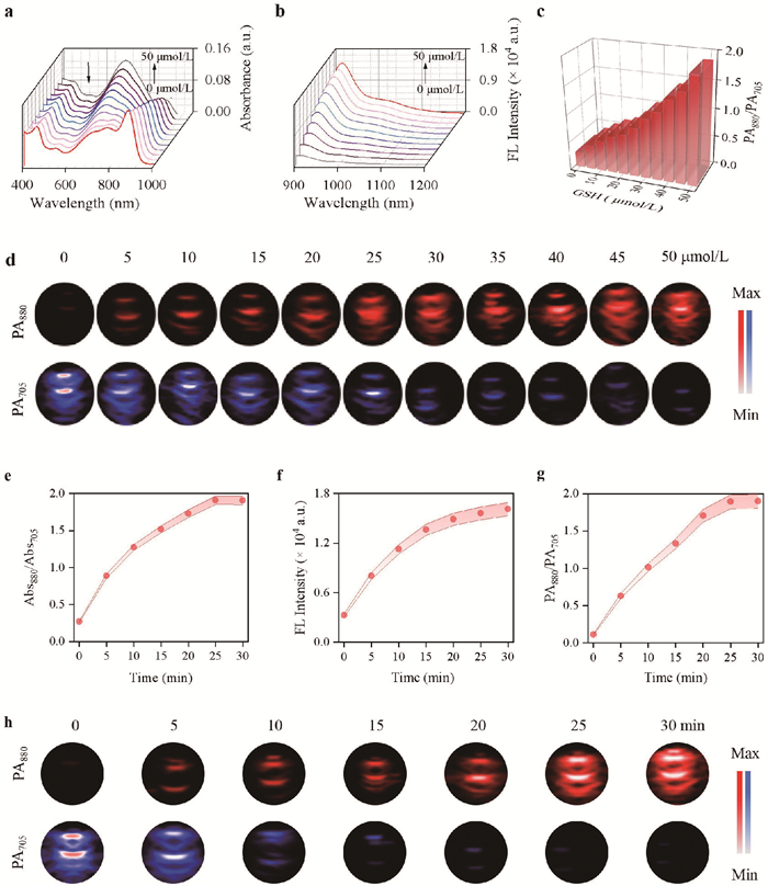 | Fig. 2. (a) UV–vis-NIR absorption, (b) NIR-Ⅱ FL spectra (λex = 880 nm), (c) the ratio of PA880/PA705 intensity and (d) the corresponding PA images of LET-14 (10 µmol/L) with the addition of GSH (0–50 µmol/L) for 30 min in DMSO/PBS (v/v = 2/3, pH 7.4). Time-dependent (e) Abs880/Abs695 intensity, (f) NIR-Ⅱ FL920 intensity (λex = 880 nm), (g) PA880/PA705 intensity and (h) the corresponding PA images of LET-14 after incubation with GSH (50 µmol/L) for 30 min in DMSO/PBS (v/v = 2/3, pH 7.4). | |