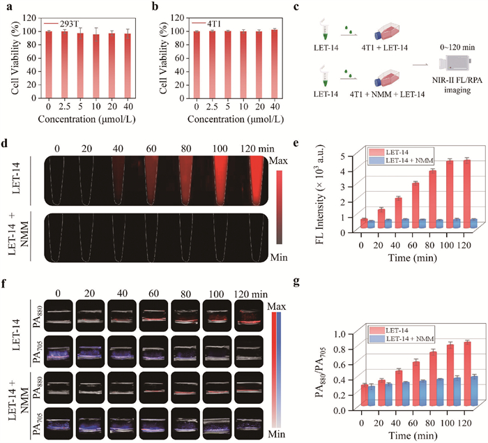 | Fig. 4. Cell viability estimated by MTT assay with HEK293T (a) and 4T1 (b) cells, which were cultured in the presence of LET-14 (0–40 µmol/L) for 24 h. (c) Schematic representation of NIR-Ⅱ FL and RPA imaging for 4T1 cells. (d) Time-dependent NIR-Ⅱ FL images of 4T1 cells with/without NMM pretreatment (0.5 mmol/L), respectively, then addition of LET-14 and (e) the corresponding quantitative FL intensity in (d). (f) Time-dependent PA images of 4T1 cells with/without NMM pretreatment (0.5 mmol/L), respectively, then addition of LET-14 and (g) the corresponding quantitative RPA intensity in (f). Data are presented as mean ± SD (n = 3). | |