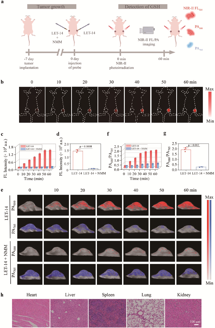 Finally, we further employed LET-14 for NIR-Ⅱ FL/RPA imaging of GSH in bilateral 4T1 tumor-bearing nude mice (Fig. 5a). All of the in vivo experiments were conducted in consistence with the approved protocol of Animal Ethics and Welfare Committee of Shenzhen University (AEWC-SZU). NMM was injected into the left tumor tissue, then LET-14 (0.5 mmol/L, 20 µL) was administered into the tumor tissues on both sides. The NIR-Ⅱ FL intensity of the tumor (right side) gradually augmented (Fig. 5b), reaching the maximum intensity within 1 h (Fig. 5c), exhibiting an 8-fold enhancement when compared to tumor (left side) pretreated with NMM (Fig. 5d). As shown in Fig. 5e, upon injection of LET-14 into tumor tissues, the PA705 exhibited a relatively strong intensity, whereas the PA880 was comparatively weak. Interestingly, with the extension of time, the PA705 gradually diminished and PA880 gradually intensified, ultimately generating a strong RPA signal within 1 h, which was 2.5-fold higher than that of tumor (left side) pretreated with NMM (Figs. 5f and g). Taken together, these results demonstrated LET-14 with high sensitivity for GSH detection in vivo through NIR-Ⅱ FL and RPA dual-modality imaging. Furthermore, the biocompatibility of LET-14 was also evaluated in vivo. As shown in Fig. 5h, the hematoxylin and eosin (H&E) stained images of major organs (heart, liver, spleen, lung, kidneys) showed no distinct organ damage or inflammation after LET-14 treatment for 14 days, indicating its good biocompatibility.