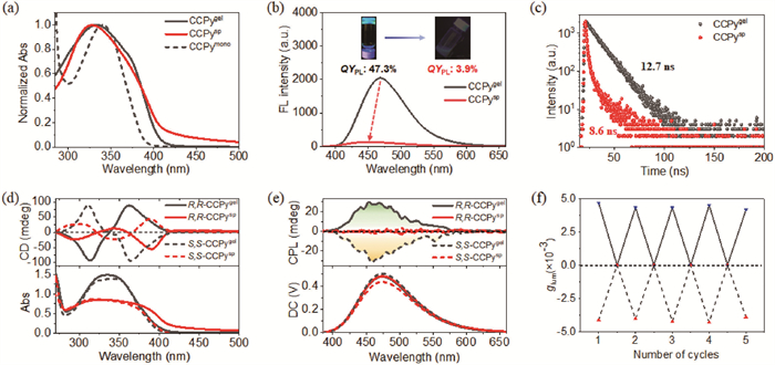 | Fig. 1. UV–vis (a), fluorescence (b), fluorescence decay curves (c), CD (d) and CPL (e) spectra of the gel (black lines) and suspension (red lines) of CCPy in toluene ([CCPy] =14.0 mmol/L). (f) Changes in glum values of CCPy assemblies in the mechanical stimulation and heating-cooling cycles: blue and red triangles represent R,R- and S,S-CCPy assemblies, respectively. λex = 340 nm. The insets in (b) are photographs of CCPy gel and suspension in toluene under 365 nm light. | |