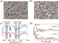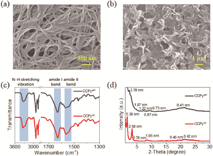 | Fig. 2. SEM images of CCPy gel (a) and suspension (b) in toluene. FT-IR spectra (c) and XRD patterns (d) of CCPy gel (black lines) and suspension (red lines) in toluene. | |