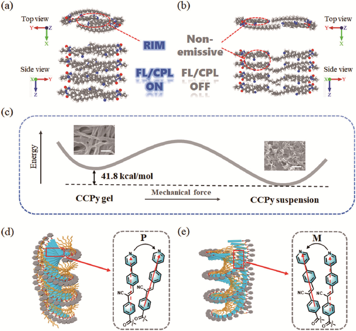 Based on a comprehensive analysis of the experimental and simulation results, the tentative mechanism for the mechanical force-induced transformation was proposed. As a chiral building block featuring hydrogen bonding sites, a rigid π-conjugated segment and a long alkyl chain, CCPy could readily self-assemble in organic solvents through multiple non-covalent interactions including hydrogen bonds, π-π stacking and van der Waals interactions. In apolar toluene, this molecule initially formed bilayers with a d-spacing value of 3.78 nm, and further organized into nanofibers, as confirmed by XRD patterns and SEM images. Throughout the assembly, the AIE-active chromophores were tightly packed, bringing forth a strong fluorescence via a restriction of intramolecular motion (RIM) mechanism. Upon applying mechanical force, the d-spacing of the assembly increased and the packing of chromophores became relatively loose, resulting in almost fluorescence quenching and CPL silence. As the calculations revealed, the total energy of CCPy assemblies in the suspension state was notably lower than that of the gel state, confirming a higher stability of the suspension, which was in good agreement with the experimental results. Owing to the point chirality of cyclohexanediamide skeleton, the molecular chirality could be efficiently transferred to the supramolecular level upon assembling. As depicted in Fig. 3d, the π-conjugated headgroups partially overlapped and were arranged in a clockwise manner in the gel state, resulting in positive signals in both CD and CPL spectra. After the application of mechanical force, however, the chromophores were packed in a counterclockwise mode that led to a negative signal in CD spectrum (Fig. 3e).