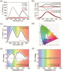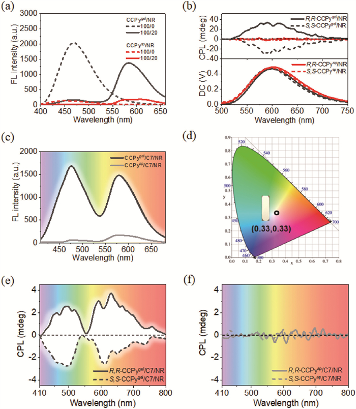 | Fig. 4. (a) Fluorescence spectra of CCPy/NR gel (black lines) and suspension (red lines) in toluene. (b) CPL spectra of CCPy/NR gel (black lines) and suspension (red lines). (c) Fluorescence spectra of the white-light emitting CCPy/C7/NR gel (black line) and suspension (grey line). (d) CIE diagram and a photograph under excitation of 365 nm showing the neat white color of the CCPy/C7/NR gel. CPL spectra of the white-light emitting R,R-/S,S-CCPy/C7/NR gel (e) and suspension (f). λex = 340 nm. [CCPy] = 14.0 mmol/L. | |