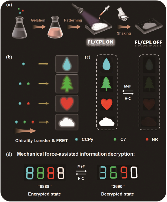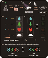 | Fig. 5. The information encryption and restorage experiment performed on the (co-)assemblies prepared from CCPy, C7 and NR. Schematic illustration of (a) the sample preparation in the information encryption experiment and (b) the (co-)assembling strategies to construct patterns with bright blue, green, red and white fluorescence. (c) The transformation between varicolored fluorescent patterns and dark patterns under 365 nm irradiation upon successive exertion of mechanical stimuli and heating-cooling processing. (d) Mechanical force-assisted decryption of information with samples prepared in different solvents. | |