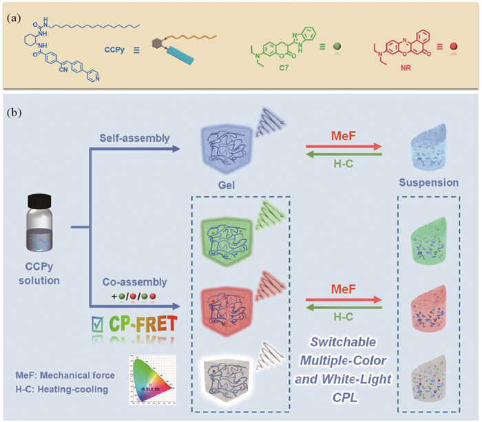 | Scheme 1. (a) Molecular structures and schematic illustrations of CCPy, C7 and NR. (b) Schematic illustration of self-/co-assembly of CCPy and the two dye molecules which leads to a mechano-responsive multi-color and white-light CPL supramolecular system. | |