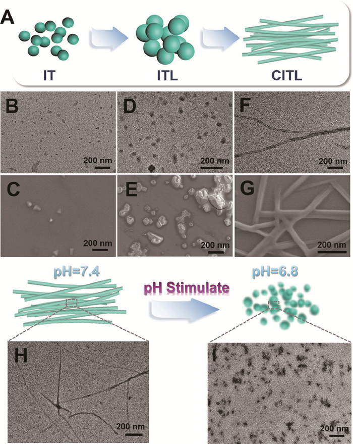 | Fig. 2. (A) Schematic representation of morphological changes in supramolecular assemblies. TEM and SEM images of (B, C) IT, (D, E) ITL, (F, G) CITL. TEM images of CITL supramolecular nanofibers dissolved in (H) pH 7.4 PBS and in (I) pH 6.8 PBS (The concentration of different assemblies was 200 µmol/L). | |