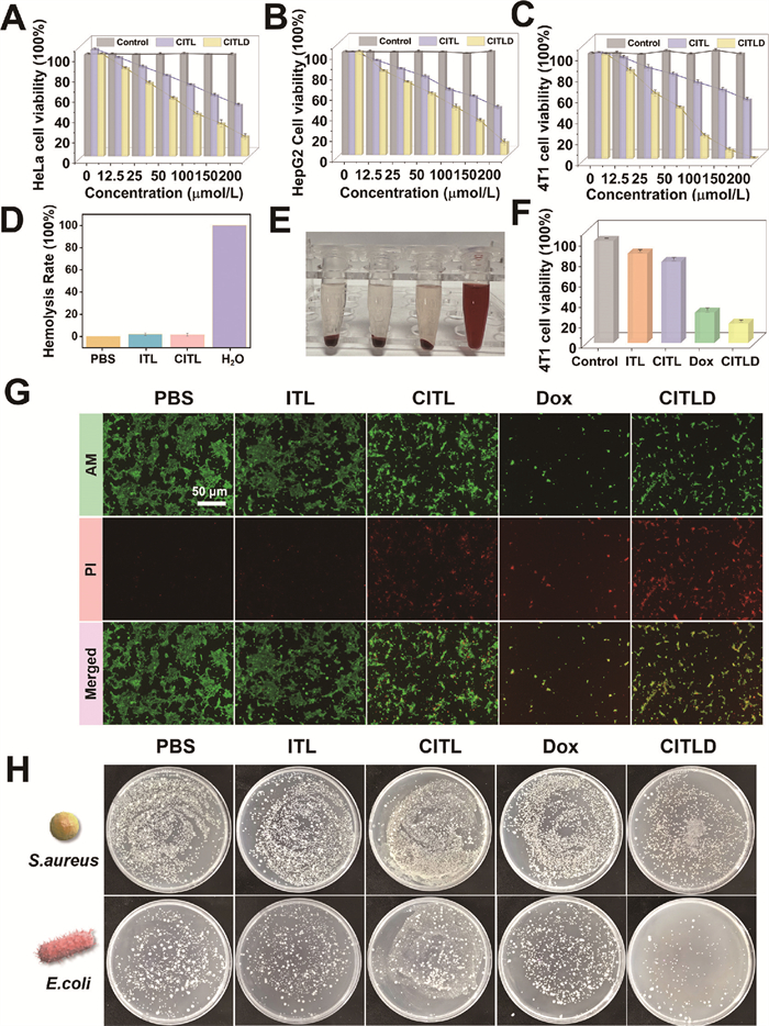 | Fig. 3. Cytotoxicity of different concentrations of CITL and CITLD on (A) HeLa cells, (B) HepG2 cells, (C) 4T1 cells. (D, E) Hemolysis rate and digital photos of red blood cells with different assemblies. (F) The 4T1 cell viability of different assemblies at a concentration of 100 µmol/L. (G) Fluorescence images of calcein-AM/propidium iodide (PI) staining of 4T1 cells treated with different groups, the concentration of samples was 100 µmol/L. (H) Digital photos of different assemblies cultured for 12 h with S. aureus and E. coli, respectively. Data are presented as mean ± standard deviation (SD) (n = 5). | |