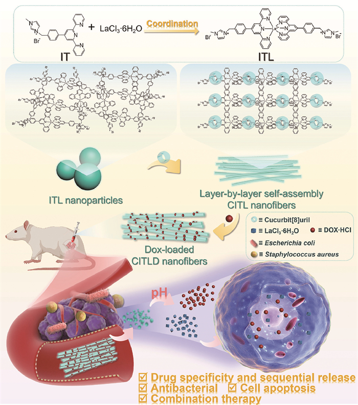 Here, supramolecular nanofibers based on cucurbituril/terpyridine (Tpy) derivatives/lanthanide ions (La3+) were constructed and studied for tumor therapy. Cucurbit[8]uril (CB[8]) was chosen as the main body of supramolecular nanofibers because of its strong selectivity, specificity and affinity, which has a wide range of chemistry, biology, material and physics. As shown in Scheme 1, n-methylimidazole-modified terpyridine (IT) was designed and synthesized as the guest molecule. Not only can Tpy complex with biomolecules become an active molecule of valid anticancer drugs, but also by Tpy with La3+ that inhibit the growth effect of cancer cells in metal coordination to obtain ITL complexes, showing lanthanide luminescence. The chelation of Tpy with rare-earth ions (La3+) under metal coordination not only exhibited lanthanide luminescence, but the anticancer effect of La3+ made the Im-Tpy/La3+ (ITL) complex a potential candidate for tumor cell inhibition. The imidazole cation at the other end of IT acted as a guest molecule and bound to the main molecule CB[8] based on the host-guest interaction, then self-assembled into supramolecular nanofibers. Interestingly, we found that the nanofibers exhibited rapid deformation under a slight change in pH and lanthanide luminescence performance, which was a great advantage for specific anticancer therapy. When regarded as nanocarriers, the nanofibers loaded with drugs enable decomposition hierarchically in the TME and play the controllable release function. More importantly, the multifunctional antibacterial behavior of nanofibers has potential applications in cancer treatment and metastasis inhibition. This work proposed an approach for drug carrier design and application by constructing multifunctional supramolecular nanofibers through layer-by-layer self-assembly, which opened up innovative insights for cancer.
