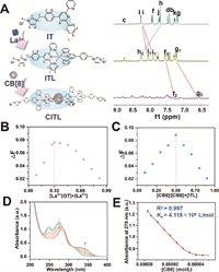 | Fig. 1. (A) The 1H NMR spectra (400 MHz, D2O, 298 K) of 1.00 mmol/L of IT, ITL and CITL. (B) Job’s plot for IT with La3+. (C) Job’s plot for CB[8] with ITL. (D, E) UV–vis spectra titration curve and the nonlinear least-squares analysis of ITL upon addition of CB[8]. | |
