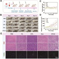 | Fig. 4. (A) Schematic diagram of the construction of the tumor mouse model and treatment process. (B) Digital photos of 1, 3, 5, 7 and 14 days mice after different groups of treatments. Curves of (C) body weight and (D) relative tumor volume of mice after intratumoral injection of different assemblies. (E) H&E and TUNEL staining of tumor tissues from the different treatment groups. Data are presented as mean ± SD (n = 5). | |