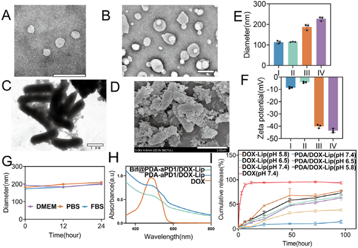 | Fig. 1. In vitro characterization of DOX formulations. TEM images of (A) blank liposomes (Lip) (scale bar: 200 nm). (B) PDA-aPD1/DOX-Lip nanoparticles (scale bar: 100 nm), and (C) Bif@PDA-aPD1/DOX-Lip biohybrids (scale bar: 1 µm). (D) SEM image of the Bif@PDA-aPD1/DOX-Lip biohybrids (scale bar: 1 µm). (E) Average particle size and (F) zeta-potential of Lip (Ⅰ), DOX-Lip (Ⅱ), PDA/DOX-Lip (Ⅲ), and PDA-aPD1/DOX-Lip (Ⅳ) (n = 3). (G) Changes of the particle size of the PDA-aPD1/DOX-Lip nanoparticles in DMEM, phosphate buffered saline (PBS), and fetal bovine serum (FBS) at 37 ℃. (H) UV–vis absorption spectra of free DOX, PDA-aPD1/DOX-Lip NPs, and the Bif@PDA-aPD1/DOX-Lip solution. (I) In vitro release profiles of free DOX, DOX-Lip, and PDA/DOX-Lip in PBS at pH 5.8, 6.5, and 7.4 (n = 3). Data are presented as mean ± SD. | |