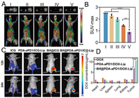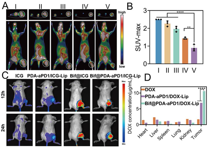 | Fig. 2. In vivo evaluation of early treatment response, targeting ability, and drug distribution in 4T1 tumor-bearing mice. (A) Representative images of 18F-FDG PET/CT on day 12 of treatment, the upper layer: the cross-sectional images, the lower layer: the coronal images (Ⅰ: control, Ⅱ: Bif, Ⅲ: DOX+aPD-1, Ⅳ: PDA-aPD1/DOX-Lip, Ⅴ: Bif@PDA-aPD1/DOX-Lip). White circles indicate tumor sites. (B) SUV-Max of each group (n = 3). (C) Fluorescence images of 4T1 tumor-bearing mice after intravenous injection of free ICG, PDA-aPD1/ICG-Lip, Bif@ICG, and Bif@PDA-aPD1/ICG-Lip. (D) DOX concentrations in major organs and tumors (n = 3). Data are presented as mean ± SD. **P < 0.01, ****P < 0.0001. | |