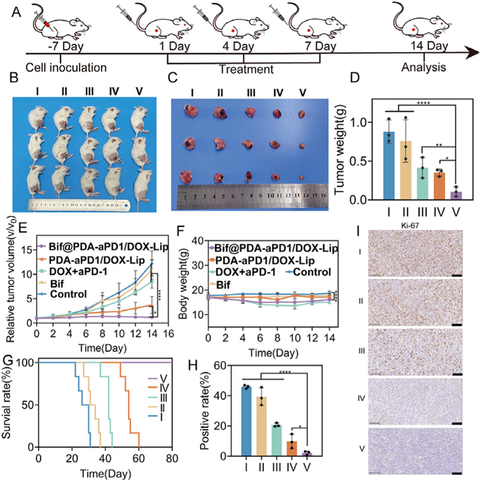 | Fig. 3. In vivo evaluation of antitumor efficacy. (A) A schematic diagram of the treatment procedure. (B) Representative photographs of 4T1 tumor-bearing mice were taken on day 14 after treatments (n = 3). (C) Representative photographs of isolated tumors (n = 3). (D) Weight of tumors (n = 3). (E) Relative change in tumor volume (v/v0) (n = 6). (F) Body weight fluctuations during treatment (n = 6). (G) Survival curves of mice after treatments (n = 6). (H) The ratios of Ki-67 positive tumor cells (n = 3). (I) Immunohistochemical staining of Ki-67 (Ⅰ: control, Ⅱ: Bif, Ⅲ: DOX+aPD-1, Ⅳ: PDA-aPD1/DOX-Lip, Ⅴ: Bif@PDA-aPD1/DOX-Lip). Scale bar: 100 µm. Data are presented as mean ± SD. P < 0.05, **P < 0.01, ****P < 0.0001. | |