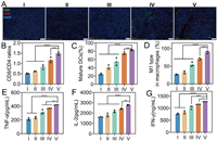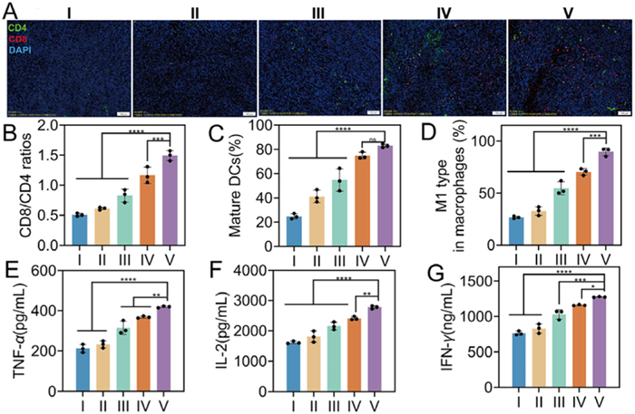 | Fig. 4. In vivo evaluation of antitumor immune response. (A) Immunofluorescence images of CD4 and CD8 T cells in tumor. Scale bar: 100 µm. Flow cytometry analysis of CD4+ and CD8+ T cells (gated on CD45+CD3+) (B), DCs (gated on CD45+CD11C+CD11b+CD86+) (C), and M1 macrophages (gated on CD45+F4/80+CD11b+CD86+) (D) in tumor. Pro-inflammatory cytokines including TNF-α (E), IL-2 (F), and IFN-γ (G) in serum (n = 3). Group names: Ⅰ: control, Ⅱ: Bif, Ⅲ: DOX+aPD-1, Ⅳ: PDA-aPD1/DOX-Lip, Ⅴ: Bif@PDA-aPD1/DOX-Lip. ns: no significant difference. Data are presented as mean ± SD. P < 0.05, **P < 0.01, ***P < 0.001, ****P < 0.0001. | |