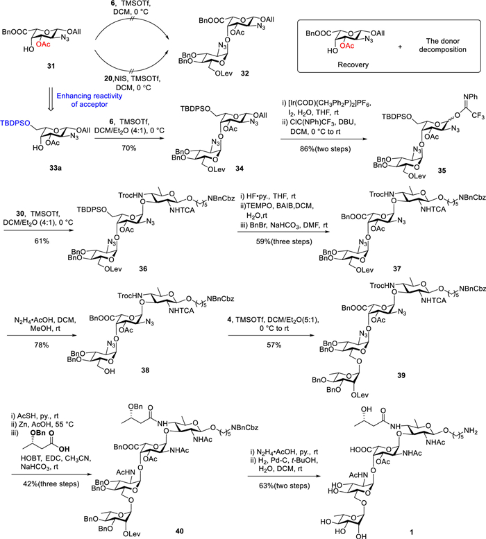 Disappointed by these results, we revised our synthetic route by replacing the Nap ether with an acetyl ester (Ac). As depicted in Scheme 5, we synthesized acceptor 31 (for details, see Supporting information). Unfortunately, glycosylation of acceptor 31 with donors 6 and 20 was unsuccessful; instead, the acceptor was quantitatively recovered unchanged after workup. Achieving glycosylation at the C4 position of L-galactose is particularly challenging when both an acetyl group and a carboxyl group are present, as these electron-withdrawing groups significantly diminish the reactivity of the acceptor. To address this limitation, we selectively protected the C6 hydroxyl group using a tert–butyldiphenylsilyl (TBDPS) ether to enhance the reactivity of the C4 hydroxyl group derivative 33a for subsequent glycosylation [57,58]. However, we observed the migration of the acetyl group to the adjacent C4 hydroxyl group of the L-Gal unit under alkaline conditions. Notably, acetyl migration rarely occurs during the reaction itself and is typically significant only after the concentration of the reaction solution. Encouragingly, the prompt separation and purification of the crude product enabled us to maintain the acetyl migration within an acceptable threshold (< 7%). Fortunately, monosaccharide allyl derivative 33a was glycosylated with donor 6, activated by TMSOTf, to generate disaccharide 34 (anomeric proton of the donor residue: 5.12 ppm, 3JH1/H2 = 3.7 Hz) with a yield of 70% and high α-stereoselectivity. Disaccharide 34 was subsequently transformed into disaccharide donor 35 by removing the allyl group and installing an N-pentyltrifluoroacetimidate on the anomeric hydroxyl, resulting in 86% yield over two steps. Donor 35 was then glycosylated with acceptor 30, leading to a mixture of α and β anomers of trisaccharide 36 (α:β = 10:1, α: anomeric proton of the donor residue: 5.07 ppm, 1JC1/H1 = 172.6 Hz) in 61% yield. After successfully obtaining the protected trisaccharide, the C6-OTBDPS group in compound 36 was cleaved using HF·pyridine. Subsequent oxidation mediated by TEMPO and BAIB, followed by benzyl ester formation using BnBr and NaHCO3 in N,N-dimethylformamide (DMF), afforded trisaccharide 37 with a yield of 59% over three steps. Cleavage of the levulinoyl ester using hydrazine acetate then furnished the C6-OH trisaccharide acceptor 38 in 78% yield. Monosaccharide donor 4 was coupled with trisaccharide acceptor 38 to generate the desired α-glycoside tetrasaccharide 39 (anomeric proton of the donor residue: 4.53 ppm, 1JC1/H1 = 170.3 Hz) in 57% yield. Reduction of the two azide groups using AcSH in pyridine was followed by treatment of the tetrasaccharide with excess zinc powder in acetic acid at 55 ℃, effectively removing the Troc group and reducing the N-trichloroacetamide to the corresponding N-acetamide. Subsequent coupling of the resulting C4 amino group with the 3S-hydroxybutyryl acid derivative afforded the desired tetrasaccharide 40 in 42% yield over three steps. Finally, removal of the levulinoyl group followed by hydrogenation delivered the target tetrasaccharide 1 with a yield of 63% over two steps.