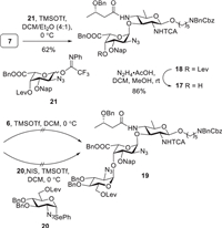 | Scheme 3. Attempts to synthesize trisaccharide 19. | |