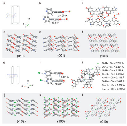 | Fig. 2. Crystal structures of CMOH-Py and CMOH-Py-Cl. The crystal macroscopic model and molecular packing in CMOH-Py (a-f) and CMOH-Py-Cl (g-l). | |