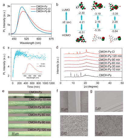 | Fig. 4. (a) PL spectra of the CMOH-Py, CMOH-Py-Cl and CMOH-Py-Br crystal. (b) Molecular orbital amplitude plots and energy levels of the HOMOs and LUMOs of CMOH-Py, CMOH-Py-Cl and CMOH-Py-Br. (c) The PL intensity, (d) PXRD and (e) optical microscope image of the CMOH-Py crystal varies with time when exposed to HCl vapors. (f) SEM images of the CMOH-Py crystal surface and (g) its cross-section before and after exposure to HCl. | |