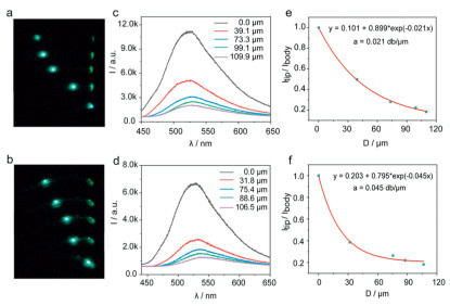| Fig. 5. Characterization of the optical waveguiding properties. Images of straight (a) and bent (b) CMOH-Py-Cl crystals excited at 405 nm at various positions. Fluorescence spectra collected from the tips of straight (c) and bent (d) CMOH-Py-Cl crystals with varying distances between the laser excitation point and the crystal tips. Decay of intensity with distance Itip/Ibody of CMOH-Py-Cl in straight (e) and bent (f) states. | |