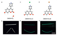 | Fig. 1. Chemical structures and mechanical properties. (a, b) CMOH-Py structure and its brittle crystal. (c, d) CMOH-Py-Cl and (e, f) CMOH-Py-Br structures and corresponding elastic crystals under 365 nm UV light irradiation. | |