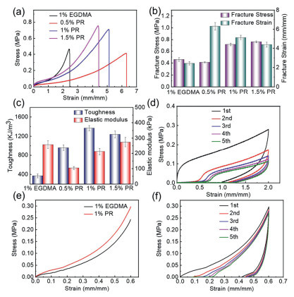 | Fig. 1. Mechanical performances of ionogels. (a) Tensile stress-strain curves of ionogels with traditional cross-linkers and different ratios of PR cross-linkers. (b, c) The fracture stresses, fracture strains, elastic moduli, and toughness calculated from the stress-strain curves shown in Fig. 1a. (d) Tensile stress-strain cyclic hysteresis loops of 1PR-IG. (e) Compression stress-strain curves of ionogels with traditional cross-linkers and 1% PR cross-linkers. (f) Compression stress-strain cyclic hysteresis loops of 1PR-IG. | |